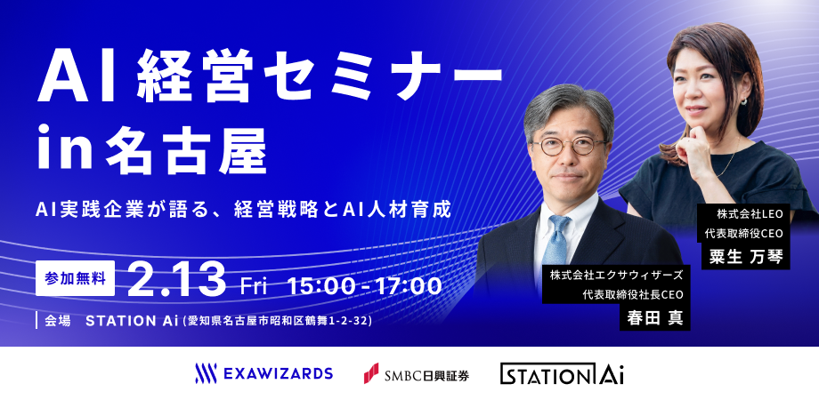 株式会社エクサウィザーズ(東京都港区、代表取締役社長CEO︓春田 真、以下エクサウィザーズ)は、2026年2月13日(金)、名古屋最大のスタートアップ支援拠点「STATION Ai」にて、東海エリアの経営層・マネジメント層を対象とした「AI経営セミナー in 名古屋 ー AI実践企業が語る、経営戦略とAI人材育成 ー」を開催します。本セミナーは、SMBC日興証券株式会社と共催、STATION Ai株式会社の協力により、東海エリアにおける企業の競争力強化とAI実装の加速を目的としています。