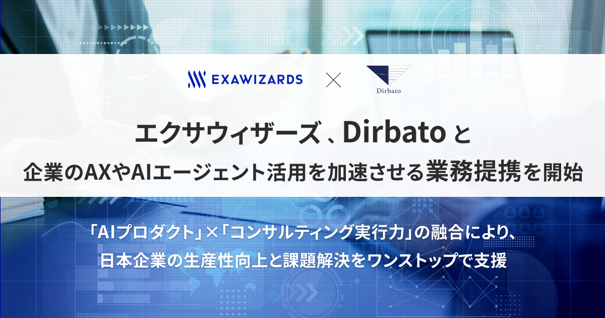 エクサウィザーズ、Dirbatoと 企業のAXやAIエージェント活用を加速させる業務提携を開始 ~「AIプロダクト」×「コンサルティング実行力」の融合により、 日本企業の生産性向上と課題解決をワンストップで支援~