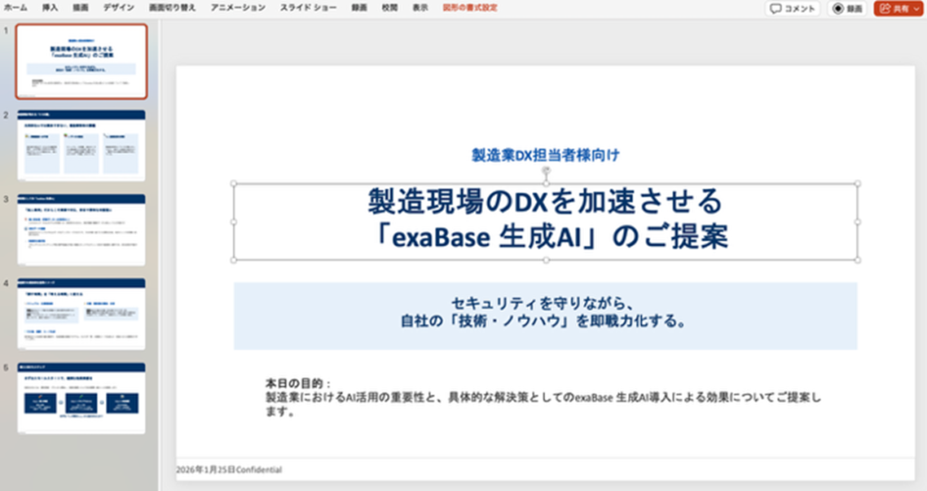 exaBase 生成AI、エージェントコレクションに PowerPointでのダウンロードが可能な資料生成エージェントを追加 ~自社テンプレートにも対応、生成後の編集作業が容易に~