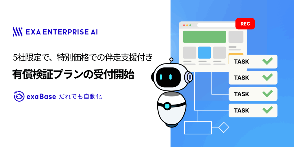exaBase だれでも自動化、5社限定で特別価格での伴走支援付き有償検証プランの受付開始 〜約3か月間の専門チームの伴走支援により、AIエージェントによる自動化効果を体感〜