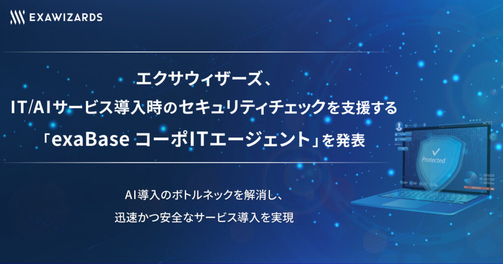 エクサウィザーズ、IT/AIサービス導入時のセキュリティチェックを支援する「exaBase コーポITエージェント」を発表 ~AI導入のボトルネックを解消し、迅速かつ安全なサービス導入を実現~