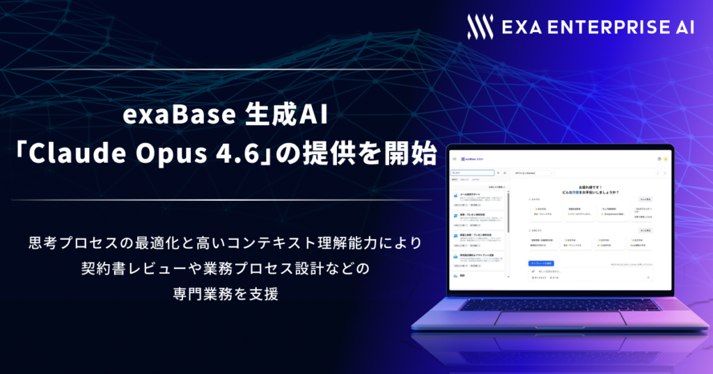 exaBase 生成AI、「Claude Opus 4.6」の提供を開始 ~思考プロセスの最適化と高いコンテキスト理解能力により、 契約書レビューや業務プロセス設計などの専門業務を支援~