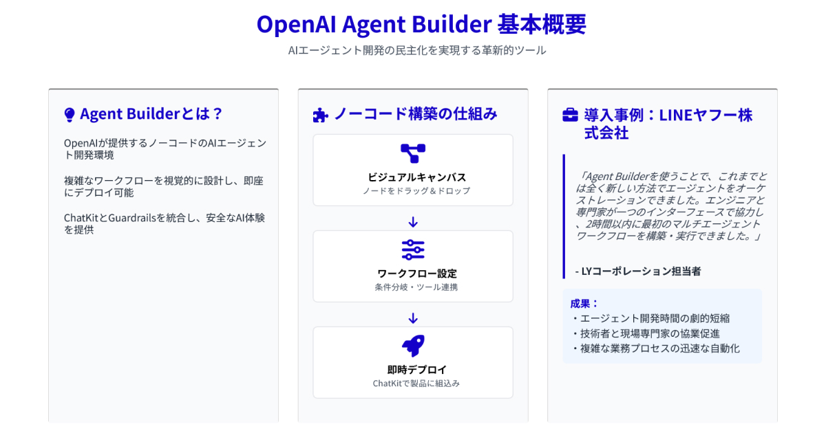 このツールの登場により、これまで専門知識が必要だったAI導入が劇的に簡単になり、プログラミング経験のある技術者が、より効率的に本格的な業務自動化を実現できるようになりました。本記事では、Agent Builderの機能から競合ツールとの違い、実際の導入方法まで詳しく解説します。