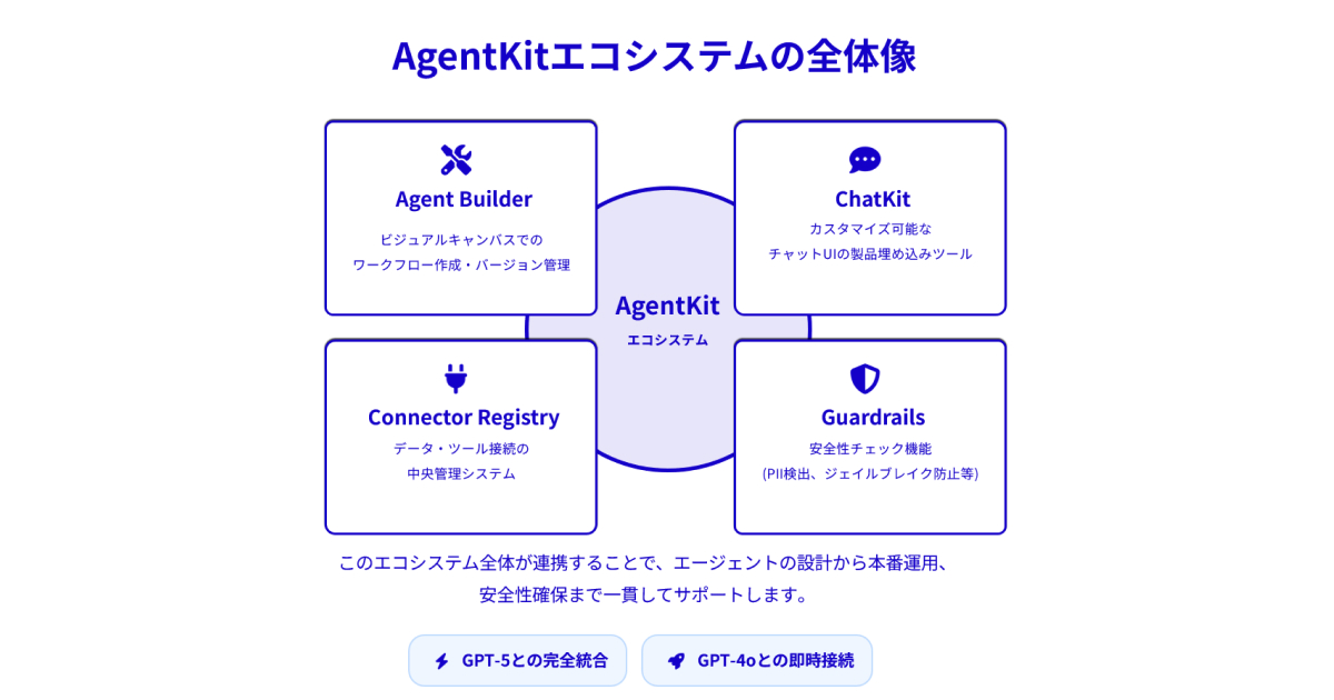 このエコシステム全体が連携することで、エージェントの設計から本番運用、安全性確保まで一貫してサポートします。特に注目すべきは、GPT-5やGPT-4oといった最新モデルに即座にアクセスできる点で、常に最高性能のAI機能を活用できる環境が整っています。
