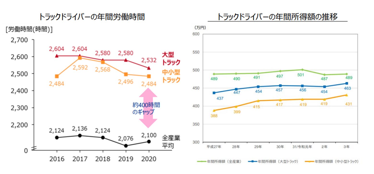 主な原因として考えられているのが、労働時間の長さと、平均賃金の低さです。下記のデータを見てもわかるように、労働時間は、全産業平均と400時間近いギャップがあり、年間賃金は全産業平均より5~10%程度低いという現状があります。こうした実情が、事態の悪化につながっているといわれています。