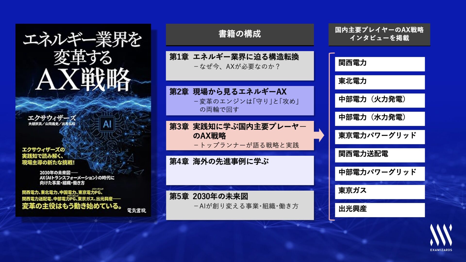 セミナーで交わされた先駆的な知見と、エクサウィザーズがこれまで多くの企業支援を通じて培ってきたAXの理論や実践知は、書籍『エネルギー業界を変革するAX戦略』に体系的に整理されています。