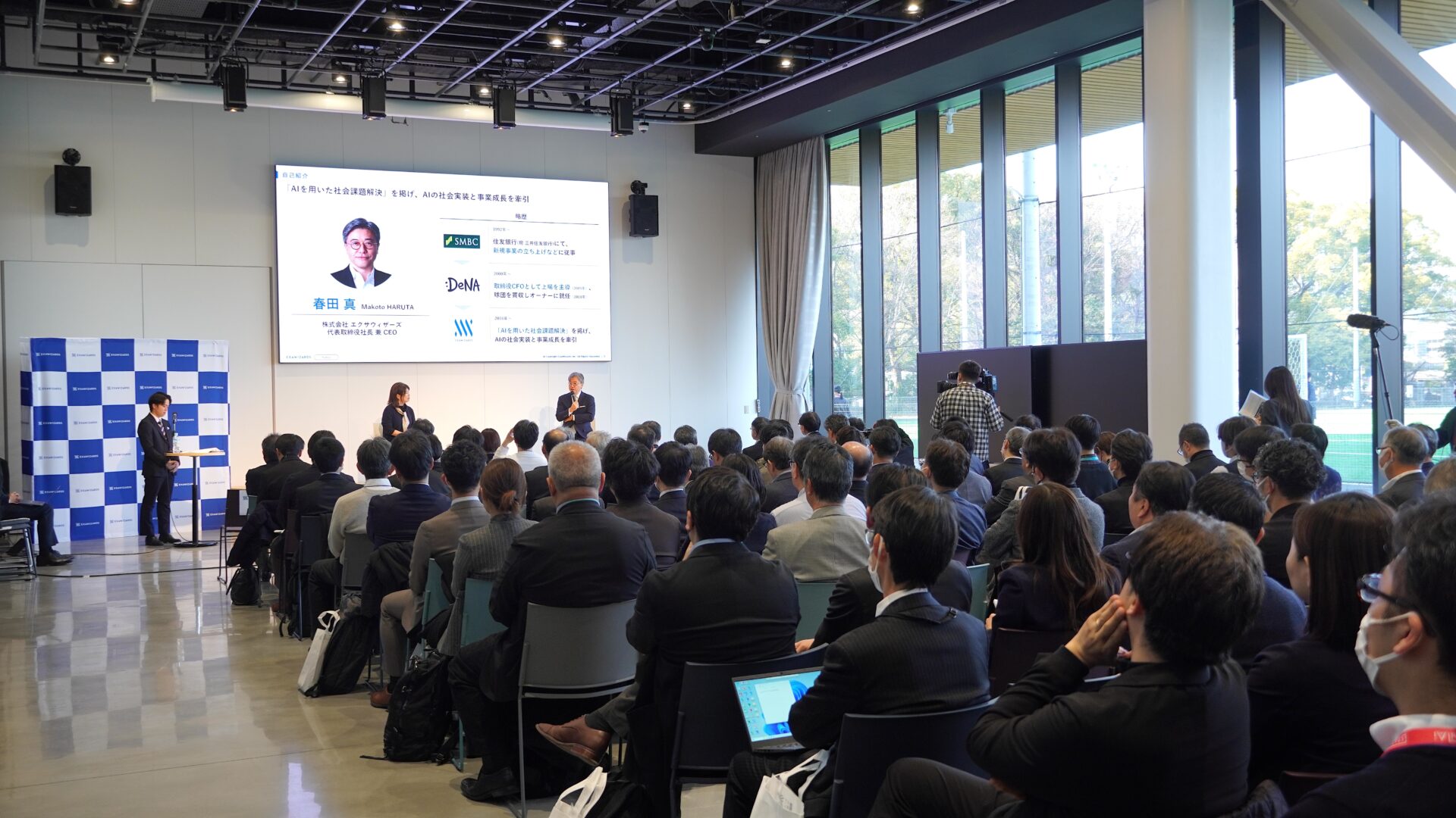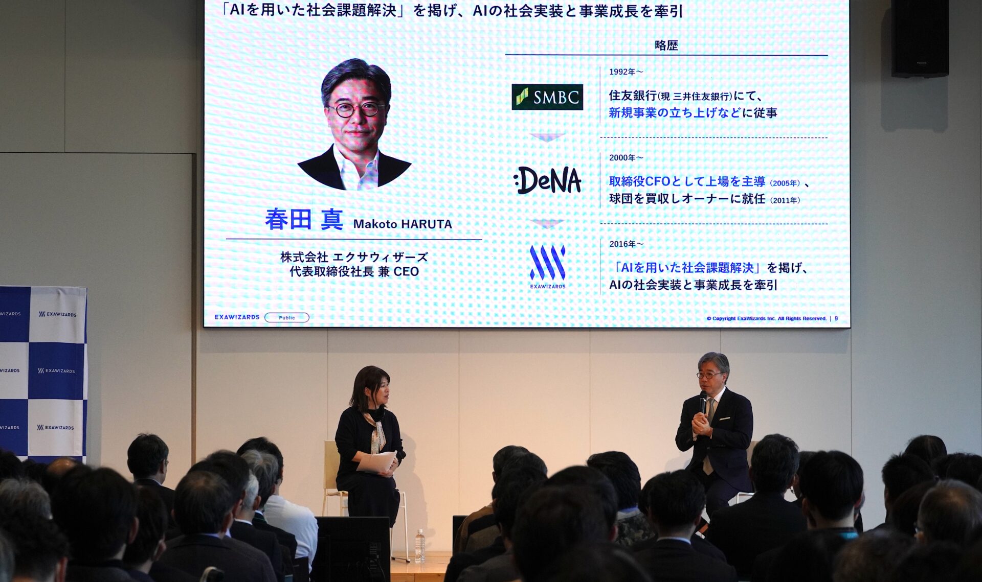 スクリーンではエクサウィザーズ 春田の経歴を紹介