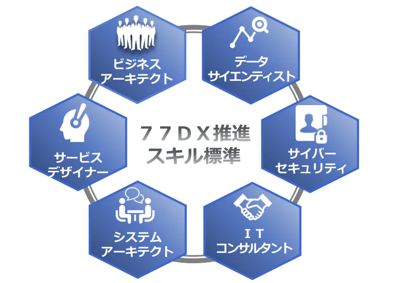 ただし、当初は、データサイエンスやAI、デザインといった領域において、専門人材の育成を進めていましたが、デジタルに関連する領域をカバーしきれていないという課題が残っていました。そこで経済産業省・IPAが定義したデジタルスキル標準¹を参考に、当行独自の「77DX推進スキル標準」を整備し、人材スキルを定義し直すことにしました。