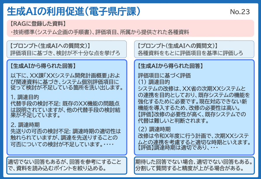 これを、RAGを活用して各所属から提供された資料や技術標準(システム企画の手順書)、評価項目のファイルを取り込むことで、最初にその妥当性をある程度分析してくれるので、業務効率がかなり上がったとのことです。