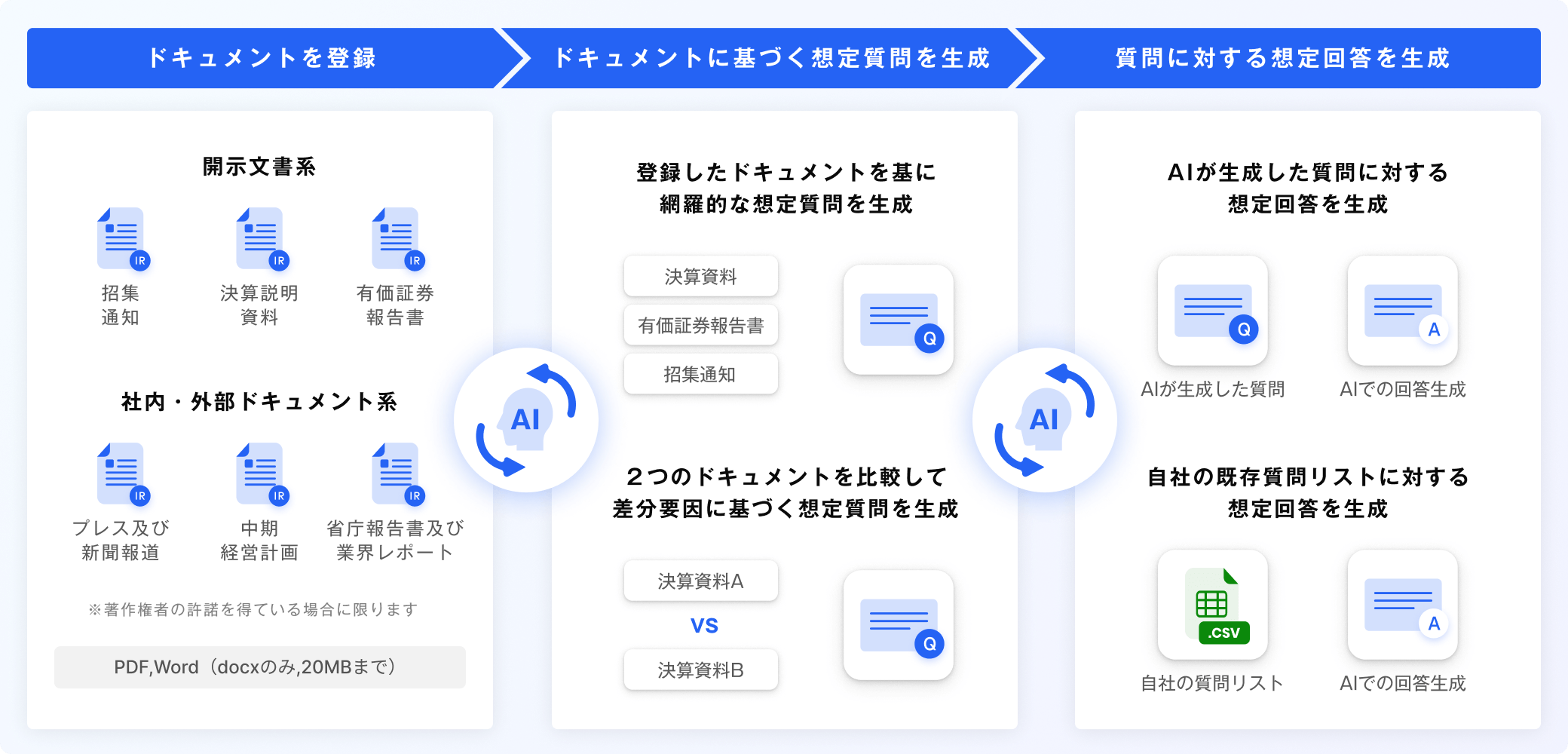 参照ドキュメントをアップロードするだけで、投資家からのさまざまな想定質問・回答の作成をサポートします