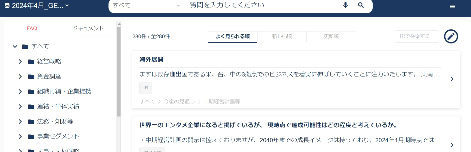 株主総会の場では「exaBase IRアシスタント」で作成した多くの想定問答を、「exaBase FAQ」で検索するという使い方をしていました。